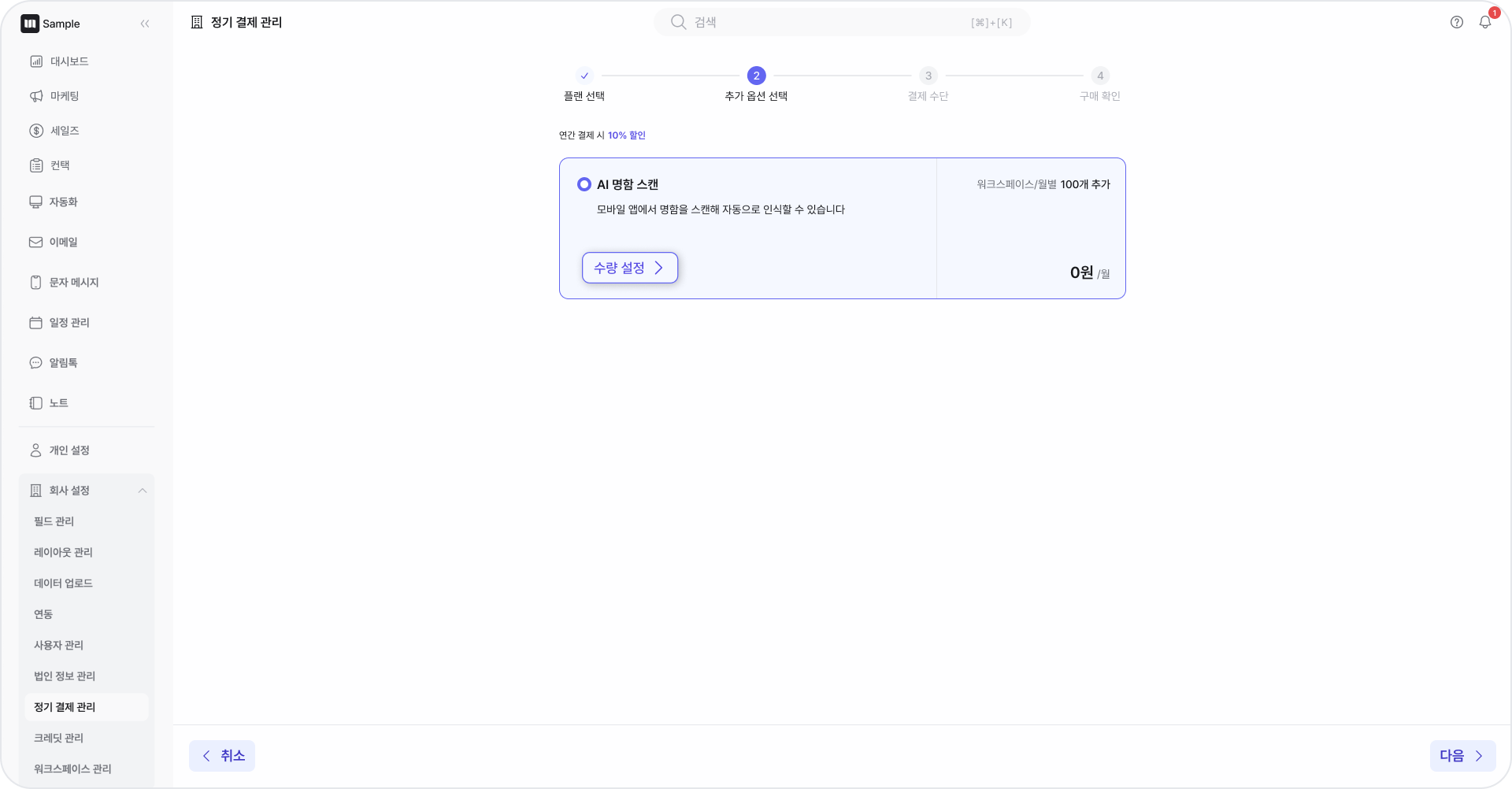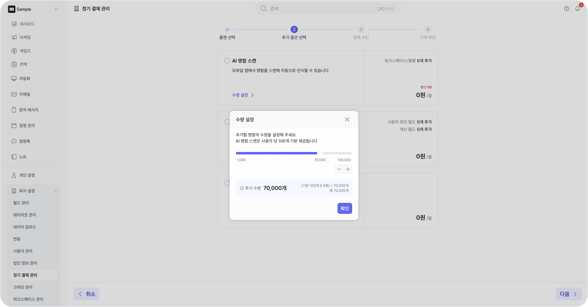 4️⃣ `명함 인식` 의 `수량 설정`을 클릭해 추가를 희망하는 수량만큼 선택합니다.