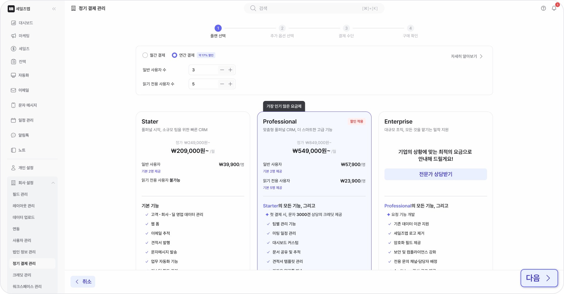 1️⃣ 세일즈맵 `메뉴` → `회사 설정` → `정기 결제 관리`를 클릭합니다.